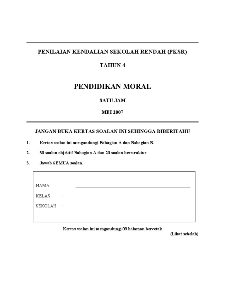 Contoh Soalan Pendidikan Moral Tahun 1 Kssr Tersoal P