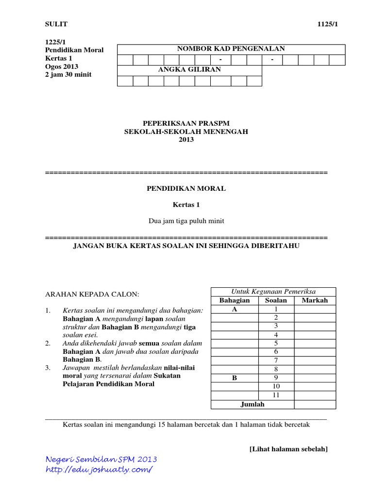 Trial Negeri Sembilan Pendidikan Moral Pra Spm 2013 Set 1 K1 Soalan Jawapan