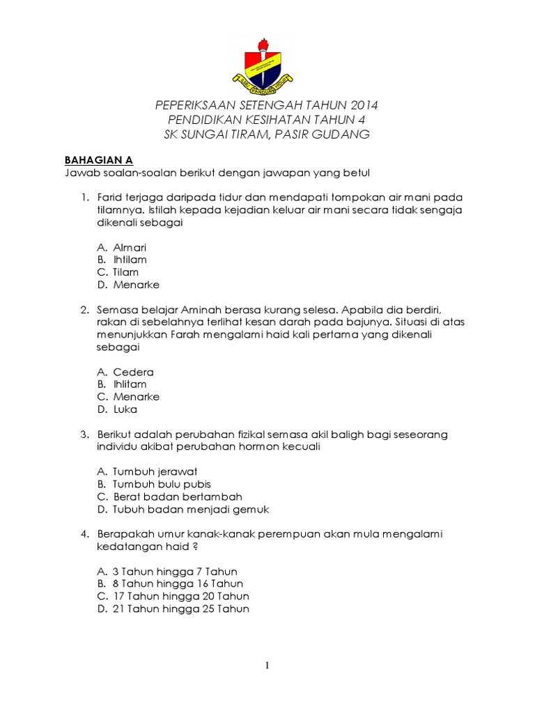 Peperiksaan Pertengahan Tahun Pendidikan Kesihatan Pk Tahun 4