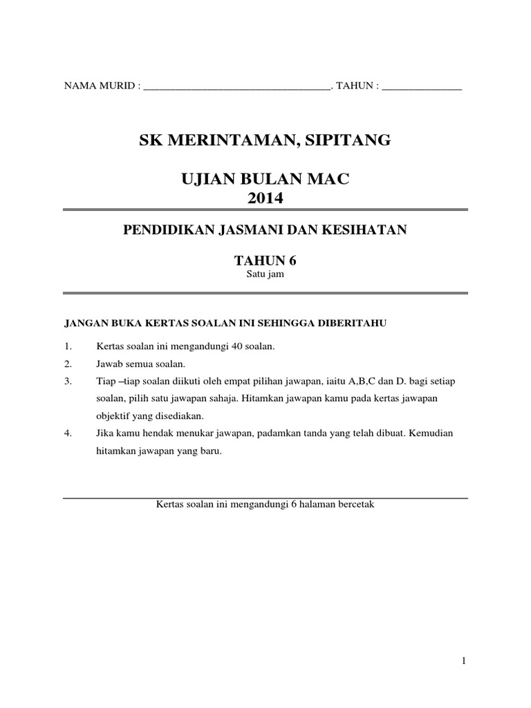 Sk Merintaman Sipitang Ujian Bulan Mac 2014 Pendidikan Jasmani Dan Kesihatan Tahun 6