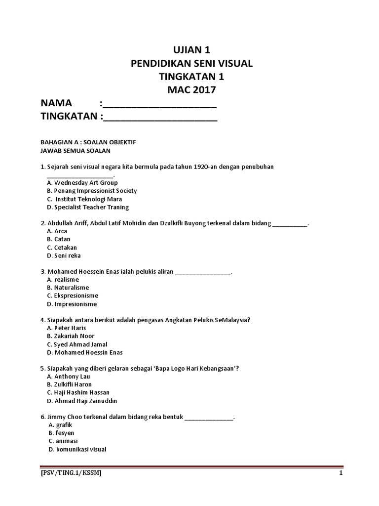 Contoh Soalan Pbs Pendidikan Seni Visual Tingkatan 2 H Soalan