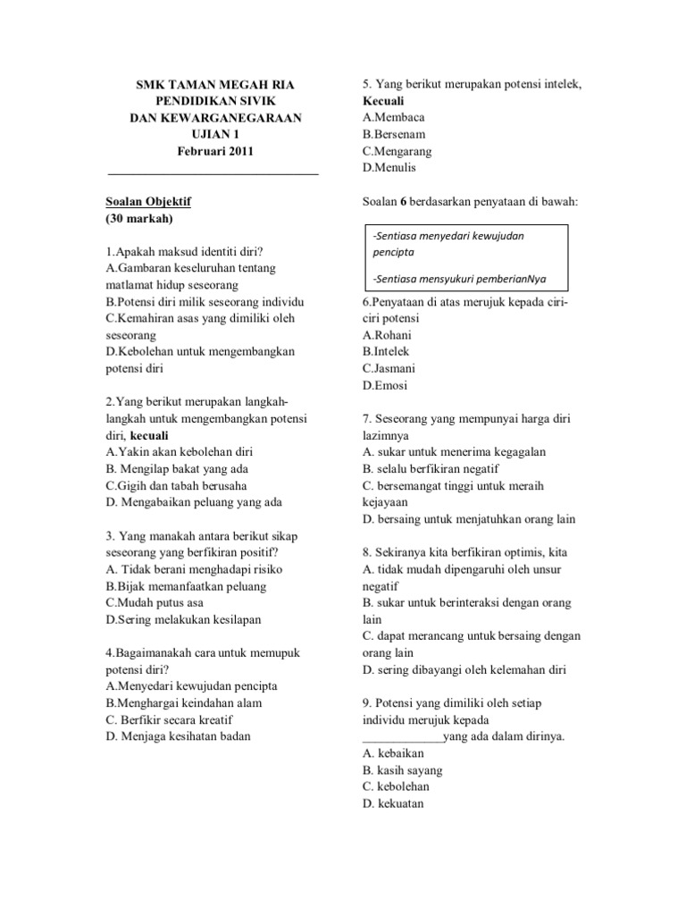 Soalan Ujian 1 Mac 2013 Pendidkan Sivik Kewarganegaraan