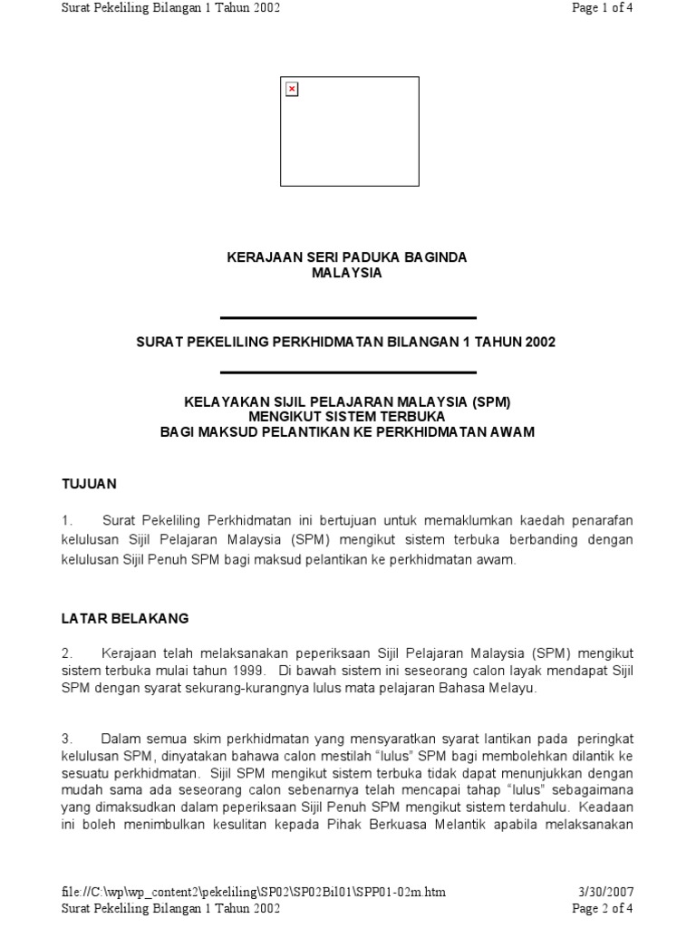 Spp Bil 01 2002 Pekeliling Kelayakan Sijil Pelajaran Malaysia Spm Mengikut Sistem Terbuka Bagi Maksud Pelantikan Ke Perkhidmatan Awam Pekeliling Terbaru Kerajaan