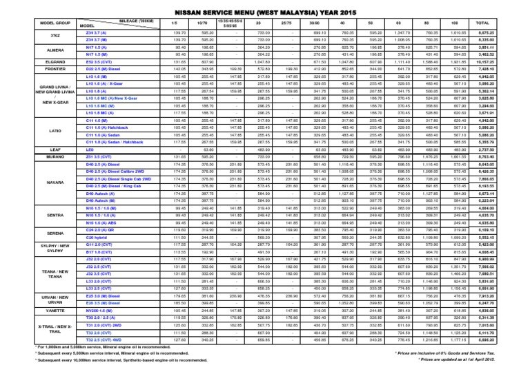Nissan Vehicle Servicing Cost In West Malaysia