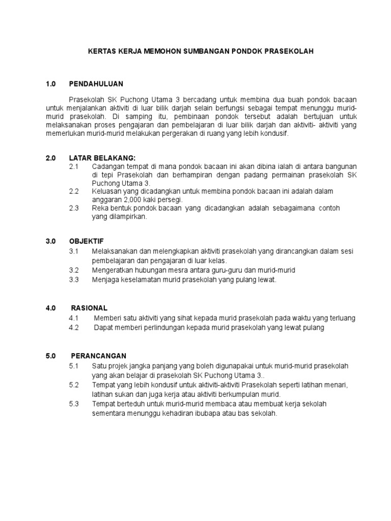 Kertas Kerja Memohon Sumbangan Pondok Prasekolah Nbsp Kertas Kerja Memohon Sumbangan Pondok Prasekolah 1 0 Pendahuluan Prasekolah Sk Puchong Utama 3 Bercadang Untuk Membina Dua Pdf Document
