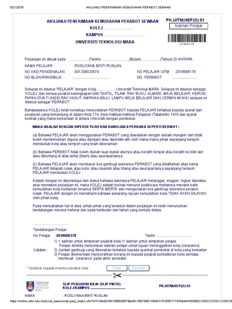 Akujanji Penerimaan Kemudahan Perabot Sewaan Pdf Pk Uitm Hep O 01 Akujanji Penerimaan Kemudahan Perabot Sewaan Salinan Pelajar Kolej Kampus Universiti Course Hero
