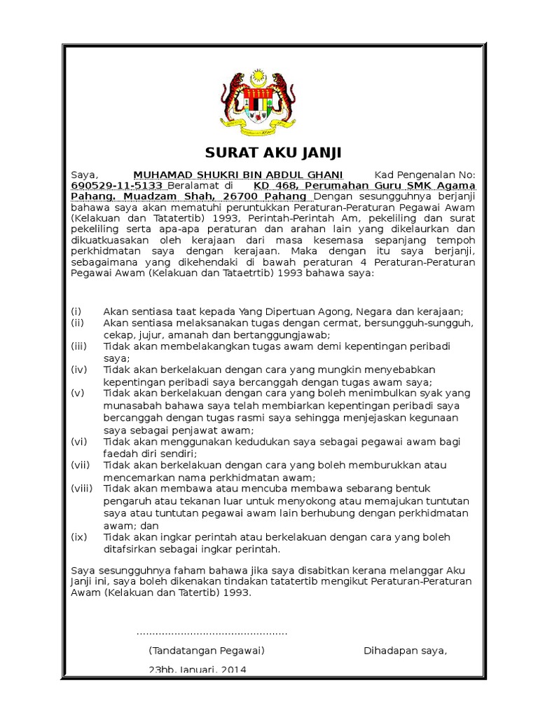 Surat aku janji berkhidmat sebagai kakitangan kerajaan by roszelan in types school work essays theses and aku janji. Sdn bhd pekeliling surat pekeliling serta peraturan dan arahan lain yang.