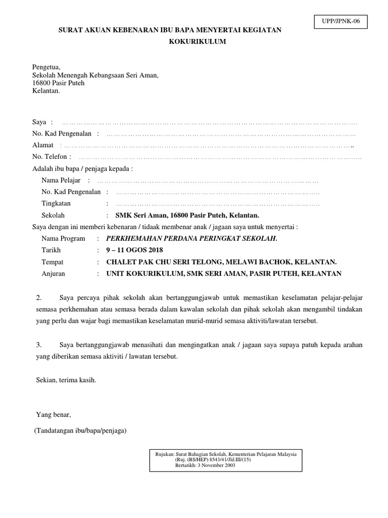 Surat Akuan Kebenaran Ibu Bapa Penjaga Menyertai Aktiviti Kokurikulum Kpm