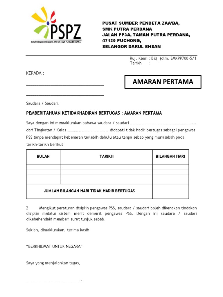 Surat Amaran Tidak Hadir Bertugas