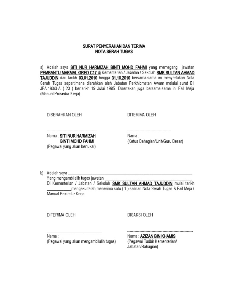 Contoh Surat Penting Contoh Nota Serah Tugas Perlu Diisi Untuk Guru Yang Berpindah Keluar
