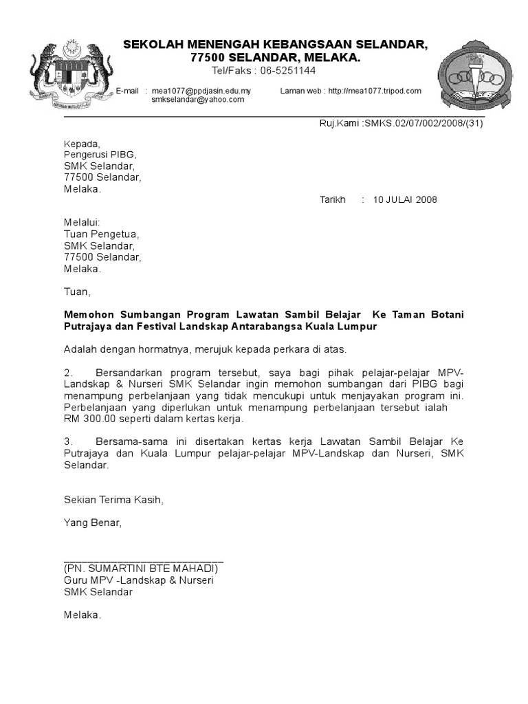 Contoh Surat Rasmi Memohon Sumbangan Untuk Lawatan Arasmi