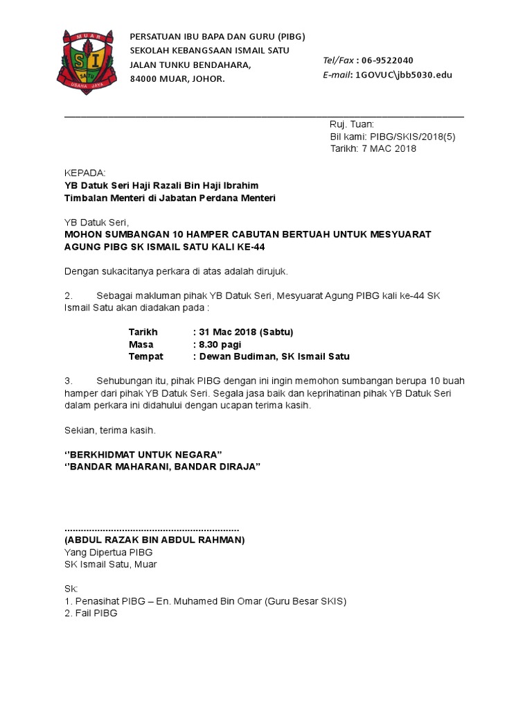 Surat Rasmi Permohonan Sumbangan Pibg Rasmi J