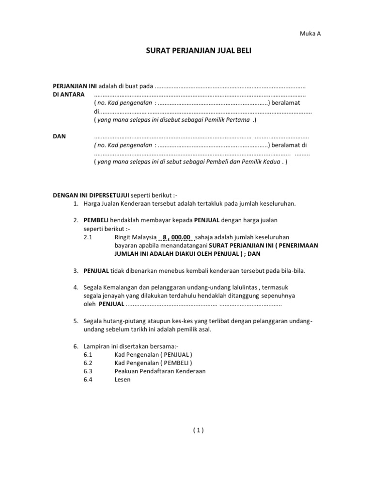 Surat Perjanjian Jual Beli Kereta Kaedah Pdf Document