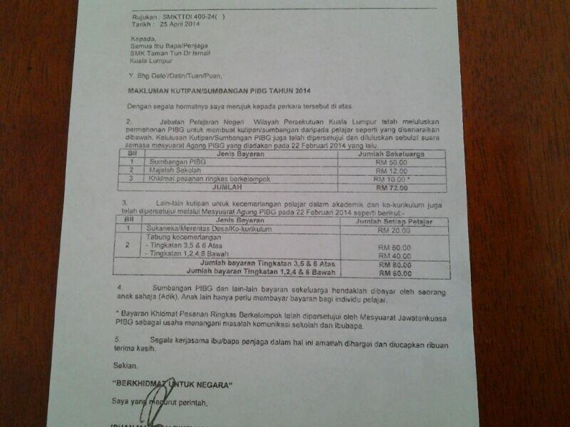 Surat Siaran Pibg Kutipan Bayaran Bayaran Tambahan Persekolahan 2015 Smk Toh Johan Trong Perak