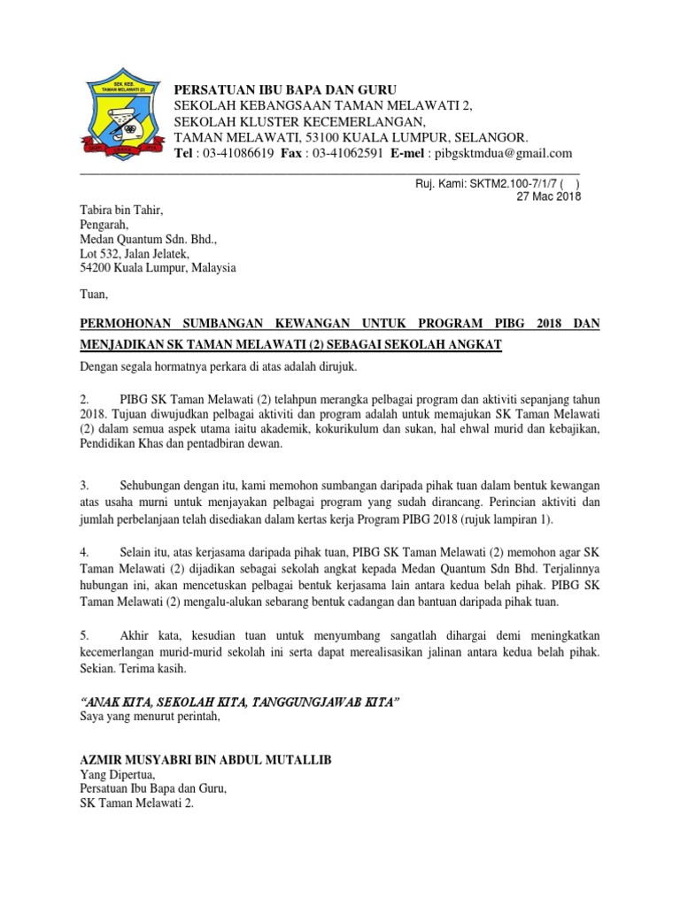 Contoh Surat Memohon Sumbangan Kewangan Daripada Pibg Contoh Surat