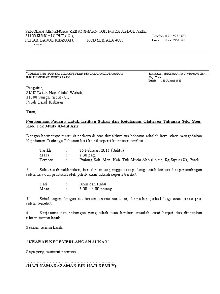 Surat Rasmi Permohonan Menggunakan Dewan Sekolah Frasmi