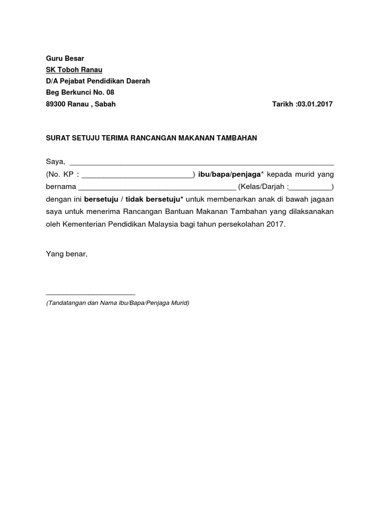 2 Surat Setuju Terima Bantuan Rancangan Makanan Tambahan 1 Malaysia