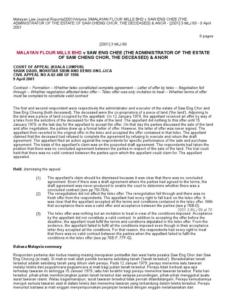 Malayan Flour Mills Bhd 2001 Offer And Acceptance Contractual Term