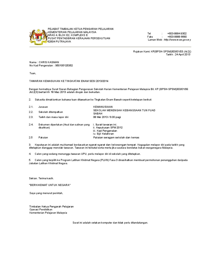 39227927 Surat Tawaran Tingkatan 6