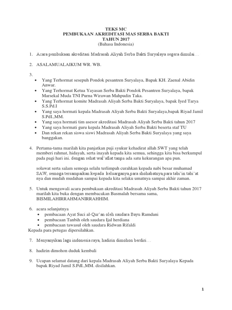 Teks Mc Acara Pembukaan Akreditasi Madrasah Aliyah Serba Bakti Tahun 2017 Docx