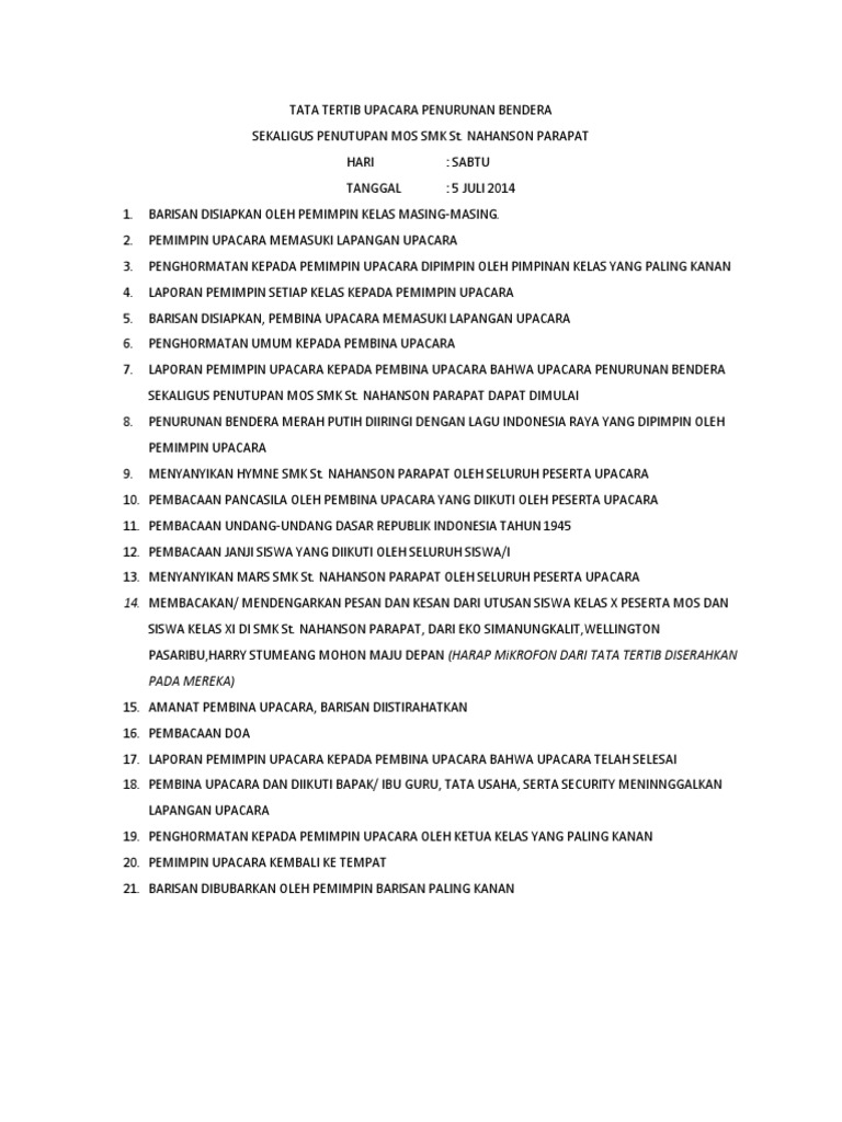 Doc Tata Tertib Upacara Bendera Kemerdekaan Ri Ke 69 Hari Minggu Tanggal 17 Agustus 2014 Di Yayasan Pendidikan Riad Madani Tema Dengan Semangat Proklamasi 17 Agustus 1945 Riad Madani Academia Edu