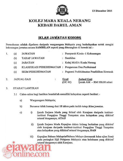 Kolej Mara Kuala Nerang 27 Disember 2015 Jawatan Kosong 2020