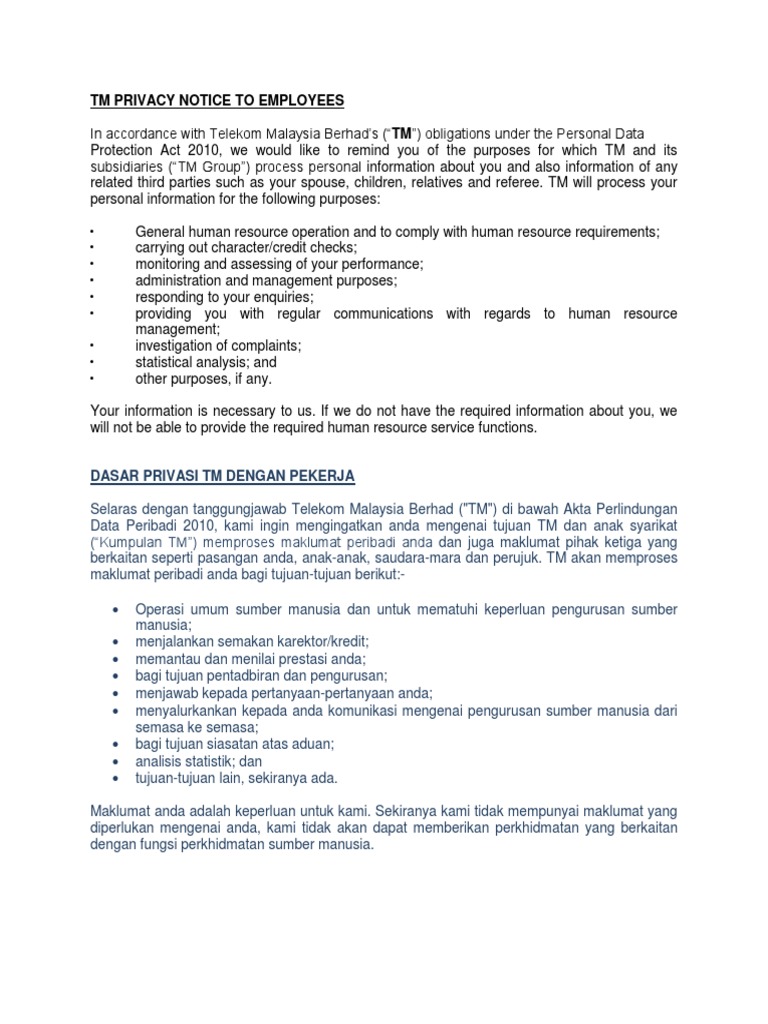 In Accordance With Telekom Malaysia Berhad S Tm Privacy Notice To Employees In Accordance With Telekom Malaysia Berhad S Tm Obligations Under The Personal Data Protection Act 2010 We Would Like To