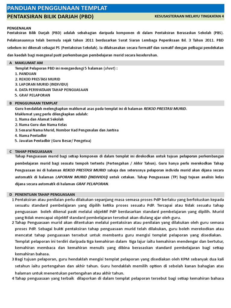Template Pbd Bahasa Melayu Tingkatan 4 Xlsx Panduan Penggunaan Templat Pentaksiran Bilik Darjah Pbd Bahasa Melayu Tingkatan 4 Pengenalan Pentaksiran Course Hero