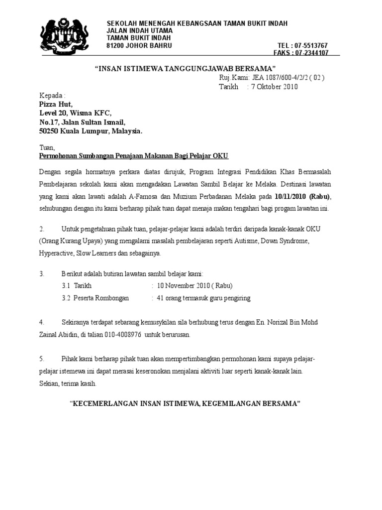 Contoh Surat Memohon Sumbangan Atau Tajaan Pendidik2u