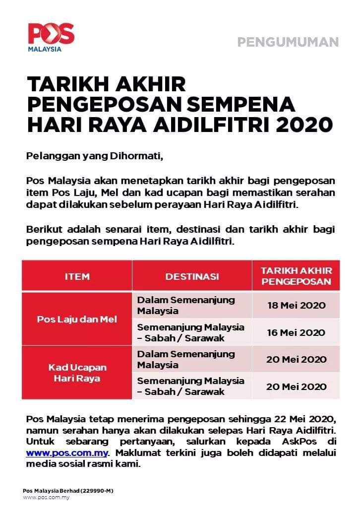 Hari Raya Tarikh Akhir Pengeposan Pos Laju Sempena Aidilfitri 2020 Edu Bestari
