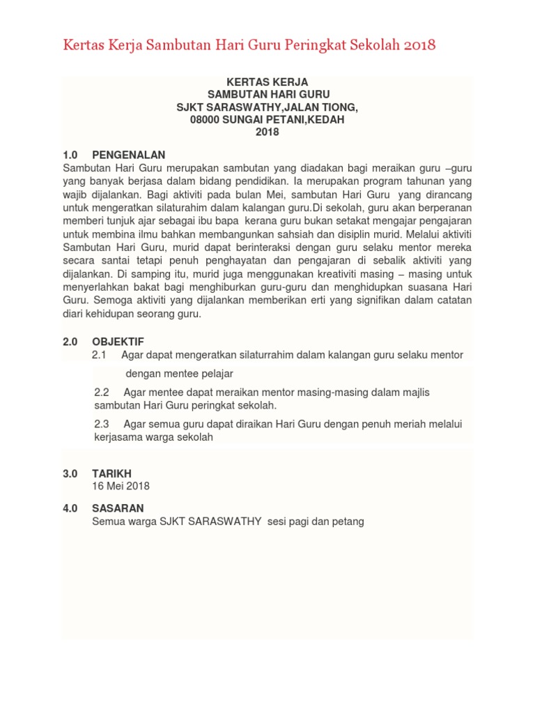 Kertas Kerja Sambutan Hari Guru Peringkat Sekolah 2018
