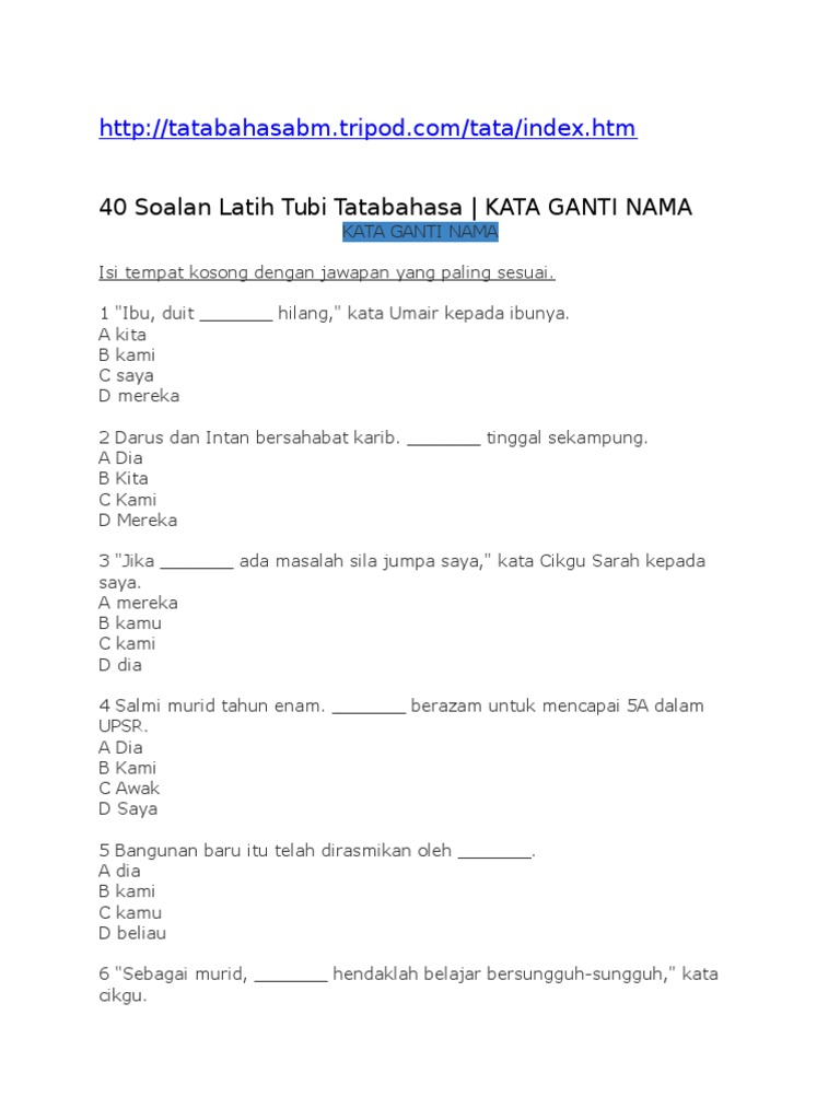 60 Soalan Kata Ganti Nama Jawapan Disediakan Justyou