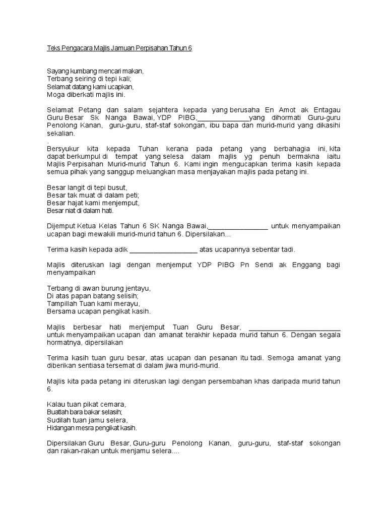 Teks Pengacara Majlis Jamuan Perpisahan Tahun 6 Sayang Kumbang Mencari Makan Terbang Seiring Di Tepi Kali Selamat Datang Teks