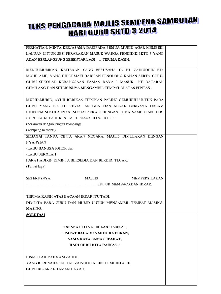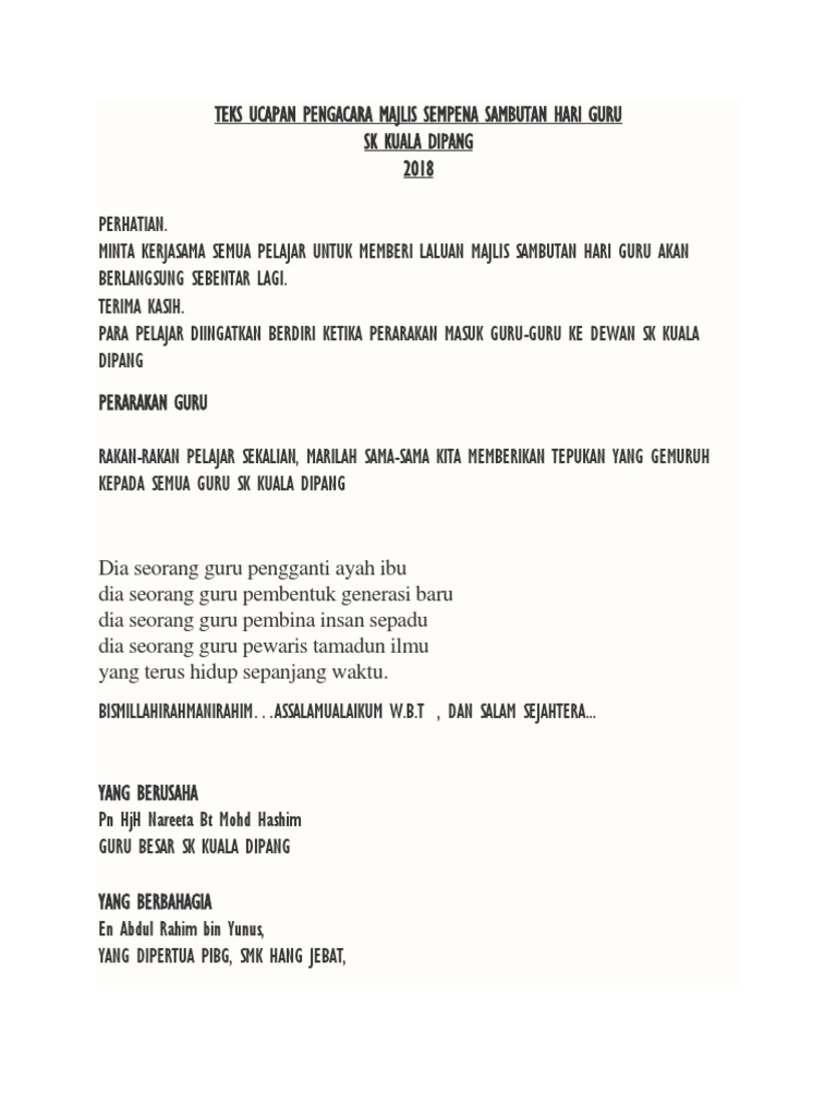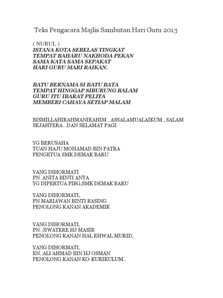Pihak majlis mohon mengambil kesempatan waktu di penghujung ini untuk mengucapkan ribuan kalungan bunga terima kasih kepada semua pihak yang terlibat dalam memastikan majlis sambutan hari guru peringkat sekolah ini dapat dilangsung dengan jayanya. Contoh teks ucapan pengacara majlis sempena hari guru teks ucapan pengacara majlis hari guru smk demak baru perhatian minta kerjasama semua pelajar untuk me slideshare uses cookies to improve functionality and performance and to provide you with relevant advertising. Hari ini merupakan hari yang sangat bermakna bagi guru guru sk kati kerana mereka diraikan sempena sambutan hari guru peringkat sekolah.