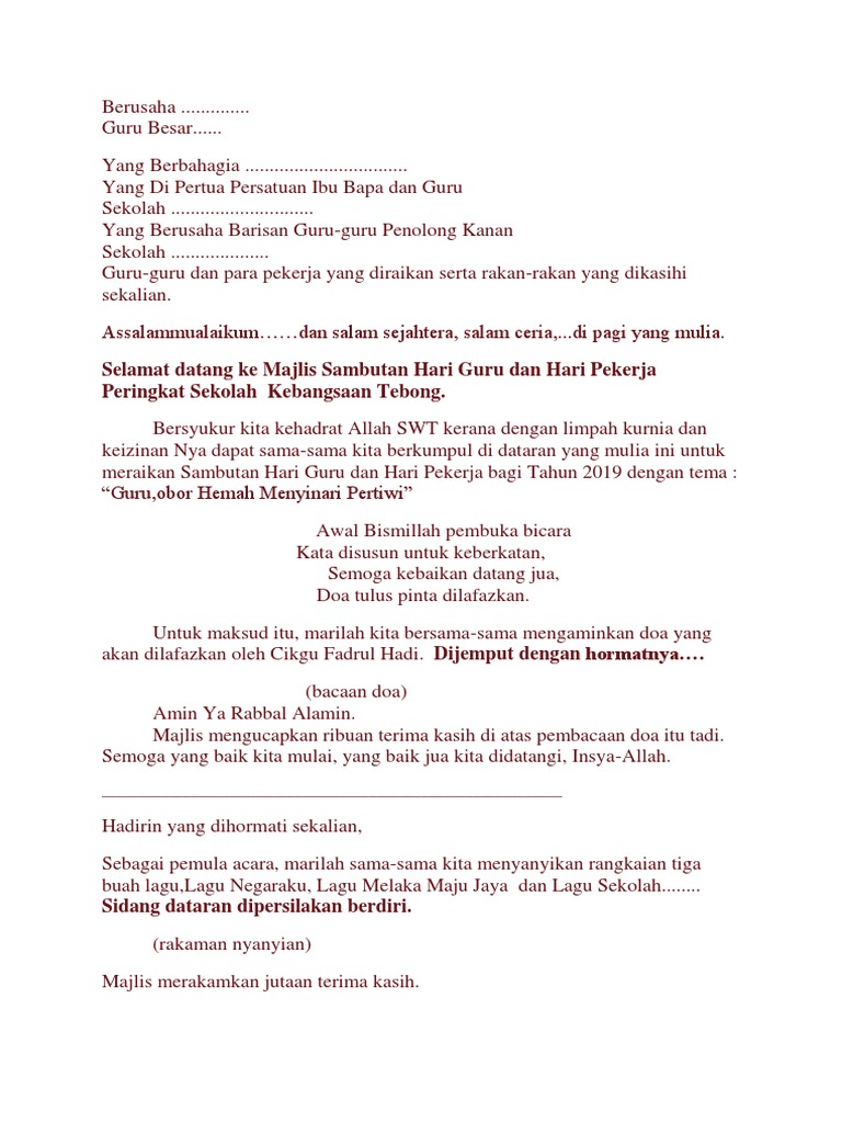Teks pengacara majlis sambutan hari guru peringkat kebangsaan. Teks pengacara majlis mc untuk majlis sambutan maulidur rasul peringkat sekolah menengah dan rendah. Salam semua ini adalah teks pengacara yang saya tulis untuk perayaan sambutan hari guru peringkat daerah kluang alhamdullillah majlis pada hari itu dapat berjalan dengan lancar dan mendapat pujian dari semua pihak syukur kepadamu ya allah tema majlis pada hari tersebut adalah futuristic dimana pengacara akan bergabung dengan paparan layar di dalam dewan. Syukur juga kerana kita sama sama dapat berkumpul di dalam majlis tahunan ini bagi meraikan majlis sambutan hari raya. Sama sama kita panjatkan rasa syukur ke hadrat ilahi kerana dengan.