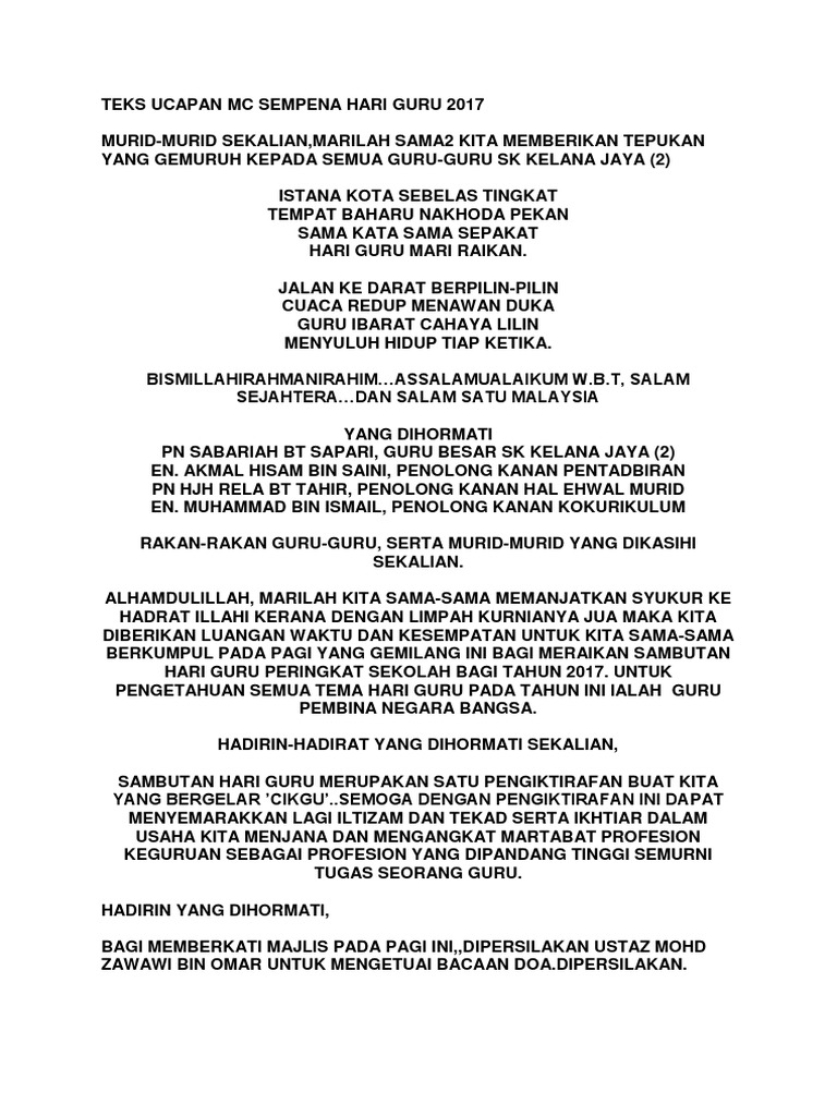 Teks perutusan hari guru 2017. Teks perutusan bos hari guru 2017 1. Guru pembina negara bangsa assalamua laikum warahmatullahi wabarakatuh salam sejahtera dan salam negaraku malaysia. Assalamualaikum warahmatullahi wabarakatuh salam sejahtera dan salam negaraku malaysia. Teks perutusan hari guru tahun 2017.