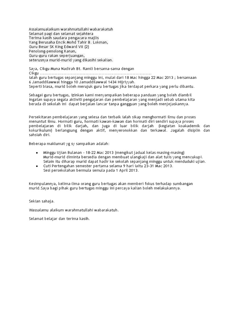 Teks Ucapan Guru Bertugas Semasa Perhimpunan Mingguan Sekolah Docx Document