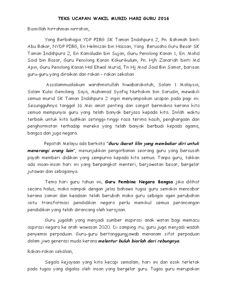 Teks Ucapan Ketua Pelajar Sempena Hari Guru