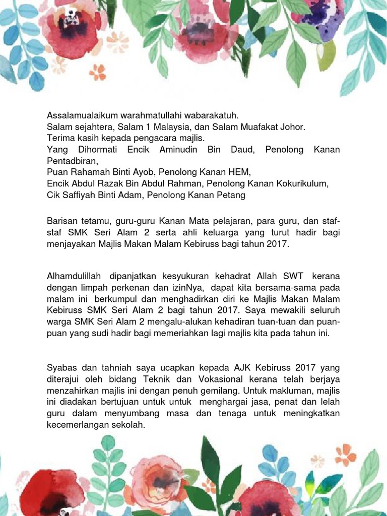 Teks pengerusi majlis malam jasamu dikenang tarikh. Teks ucapan sempena makan malam pelajar tahun akhir yang berusaha dr. Bmm3112 sejarah perkembangan bm perkamusan dan terjemahan. Teks ucapan sempena majlis perasmian penutup kursus kredibiliti smk elopura 2 2015.