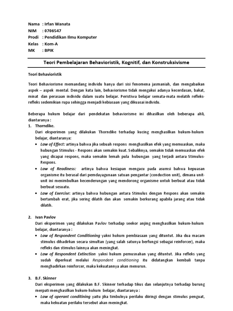 Perbedaan Teori Belajar Behavioristik Dan Kognitif Pdf Cara Mengajarku