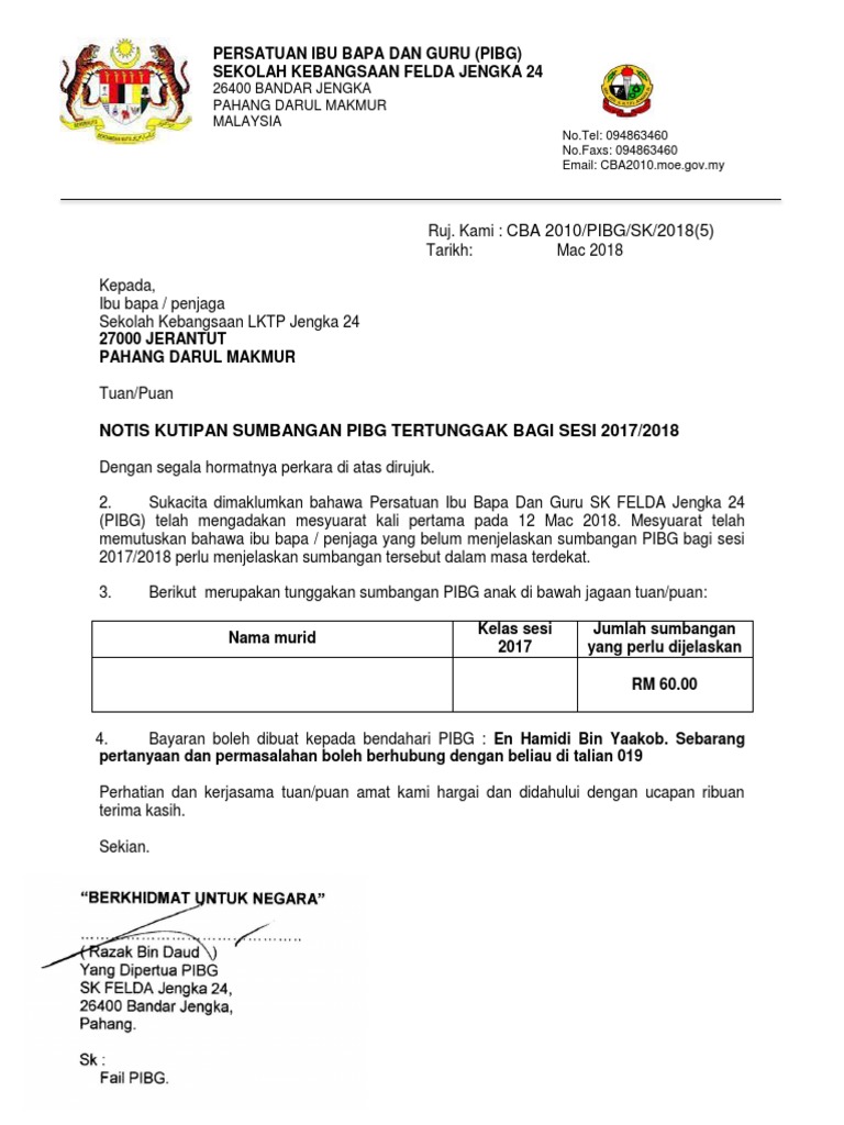 Tertunggak Contoh Surat Tunggakan Yuran Sekolah
