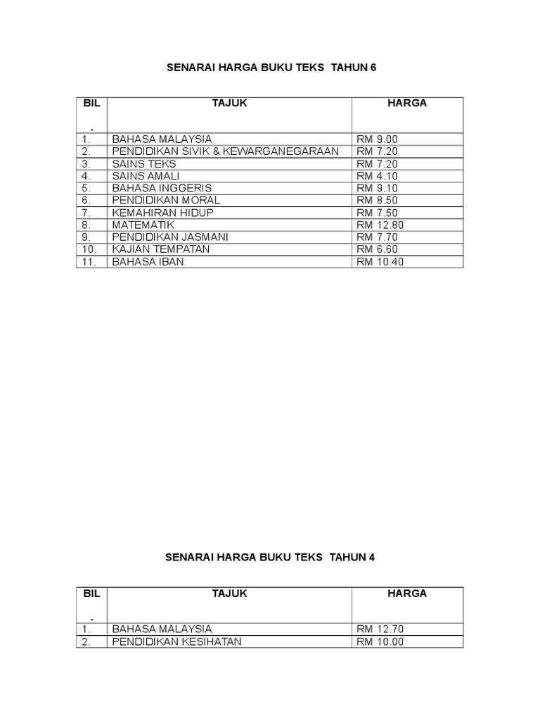 Harga Buku Teks Tahun 6