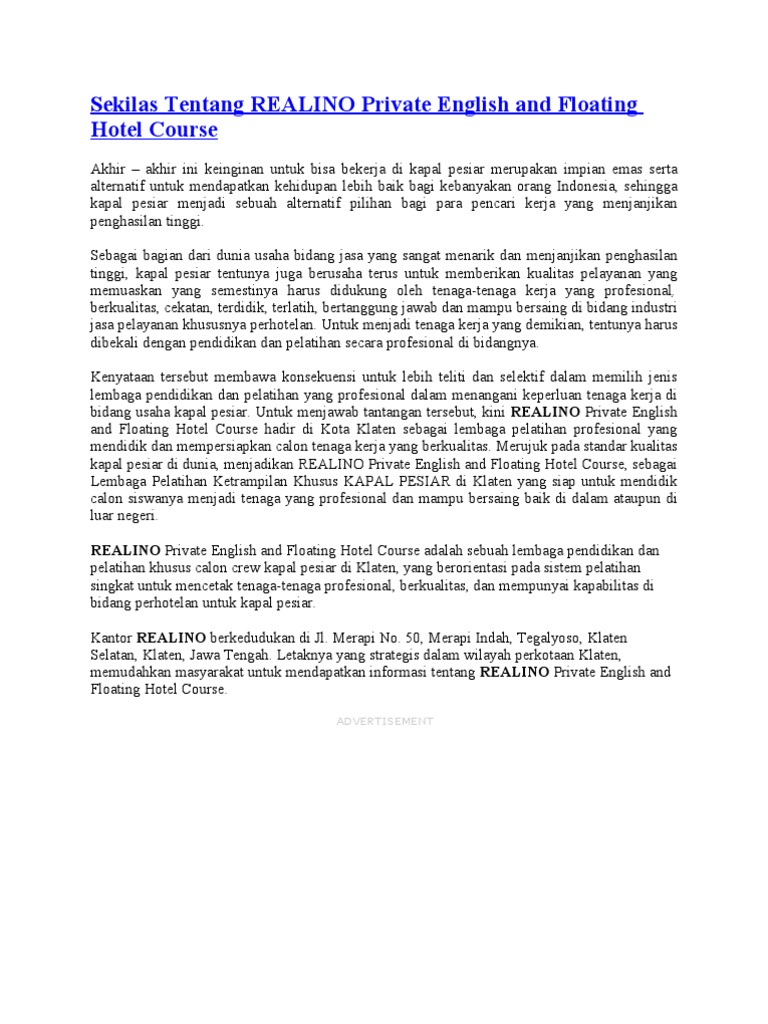 Sekilas Tentang Realino Private English And Floating Hotel Pelaut Pengiriman