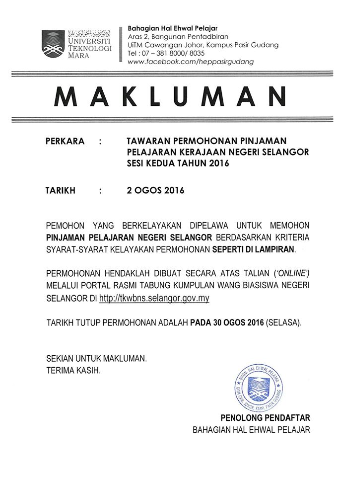 Mpp Uitm Pasir Gudang On Twitter Tawaran Permohonan Pinjaman Pelajaran Negeri Selangor Sesi Ke 2 2016 Https T Co I79pxbl4lu Uitmpg