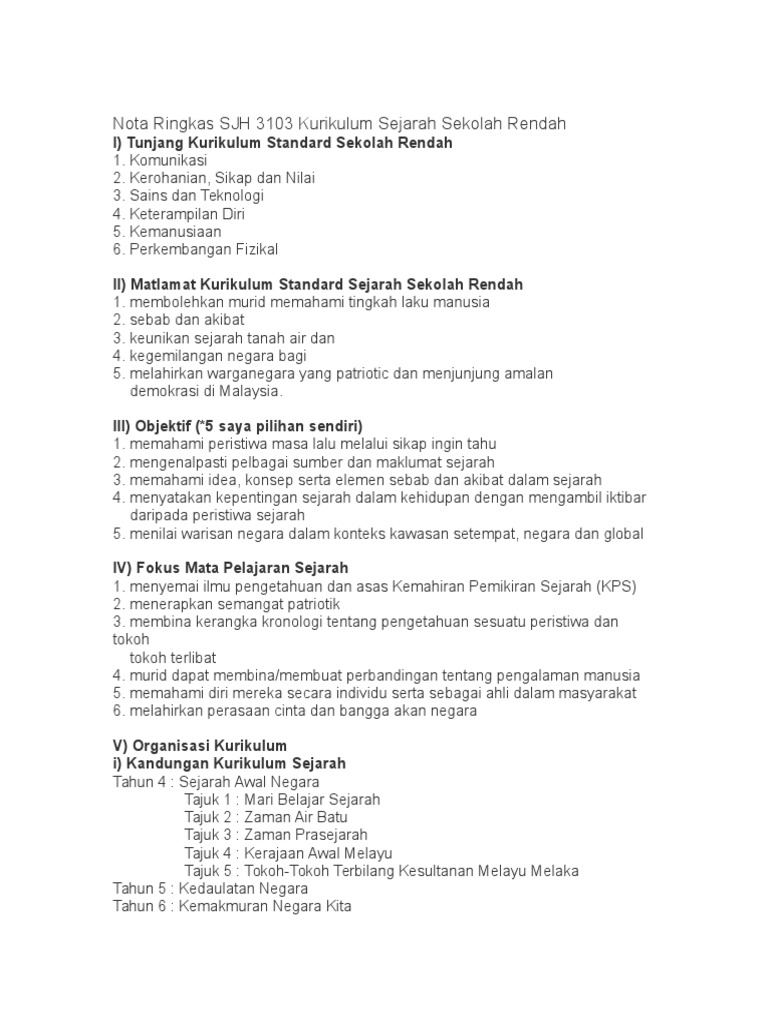 Nota Ringkas Sjh 3103 Kurikulum Sejarah Sekolah Rendah Docx
