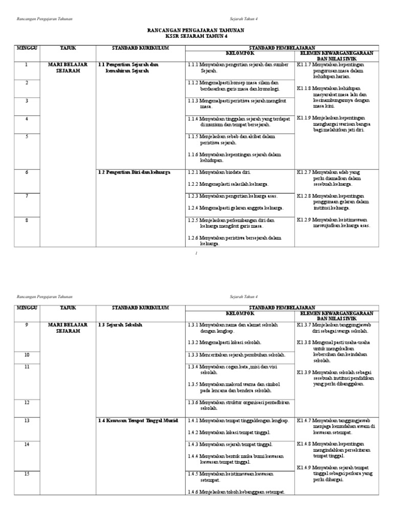 Rancangan Pengajaran Tahunan Sejarah Tahun 4 2014 Doc Doc Document