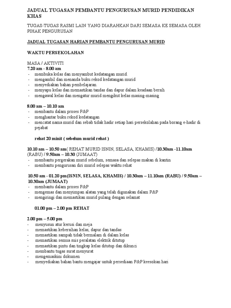 Jadual Tugasan Pembantu Pengurusan Murid Pendidikan Khas