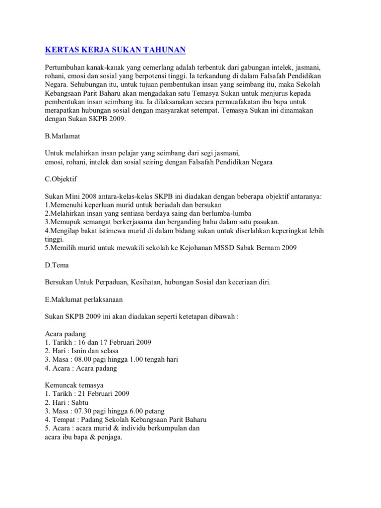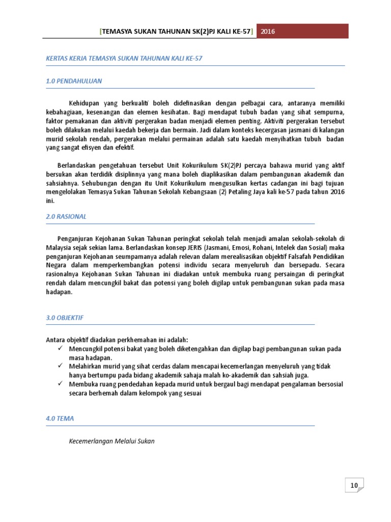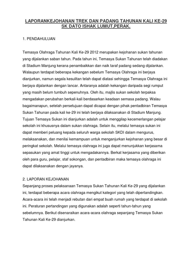 Tujuan temasya sukan tahunan diadakan di sekolah. Sebelum sukan diadakan semua guru dan murid sibuk membuat persiapan padang dihiasi dengan panji panji dan belon belon yang berwarna warni. Anda dikehendaki menyediakan laporan tentang temasya sukan tahunan yang dijalankan di sekolah kamu. Contoh rangka karangan. Satu mesyuarat post mortem temasya sukan sekolah telah diadakan pada 11 mac 2010 jam 1 00 petang di kelas tahun 6 delima mesyuarat ini diadakan bertujuan berbincang perkara perkara berbangkit yang timbul semasa temasya sukan berlangsung pada 4 mac 2010 yang lalu.