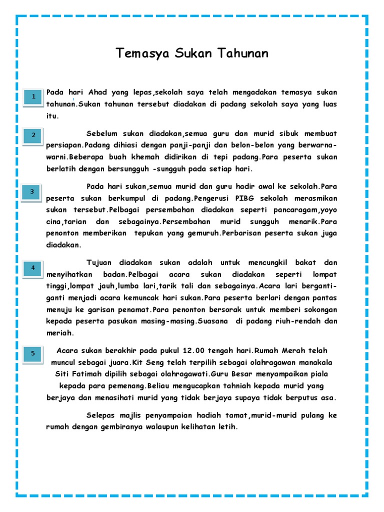 Sebanyak 8 buah rumah sukan mewakili sekolah. Ia diadakan di padang tan sri noraini ahmad bermula pada pukul 7 45 pagi. Sediakan laporan itu selengkapnya. Pada hari ahad yang lepas sekolah saya telah mengadakan temasya sukan tahunan sukan tahunan tersebut diadakan di padang sekolah saya yang luas itu.