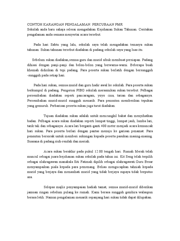 Tujuan hari sukan itu diadakan adalah untuk mencungkil bakat murid dalam bidang kesukanan di samping melaksanakan aktiviti tahunan sekolah. Antara tujuan utama continue reading contoh karangan. Contoh rangka karangan. Sebelum sukan diadakan semua guru dan murid sibuk membuat persiapan padang dihiasi dengan panji panji dan belon belon yang berwarna warni beberapa buah khemah didirikan di tepi padang para peserta.